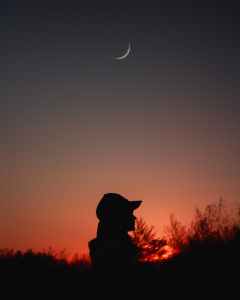silhouette of person wearing cap under crescent moon
