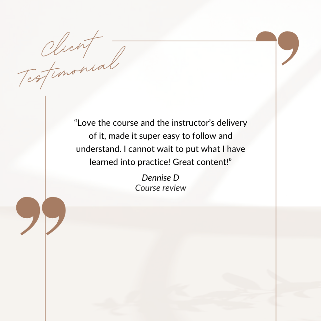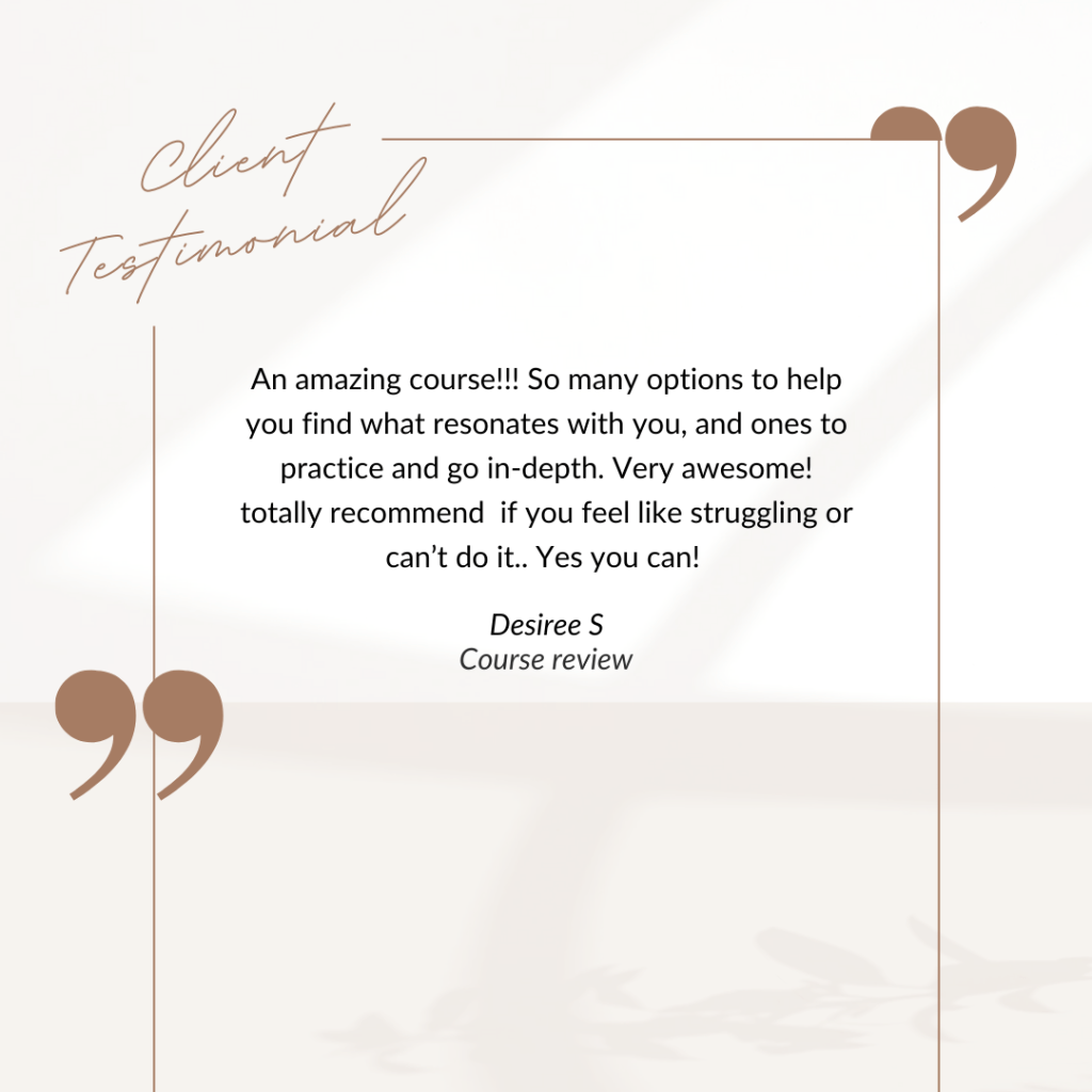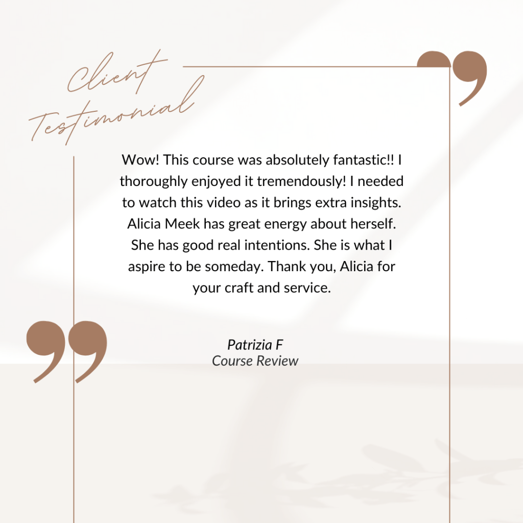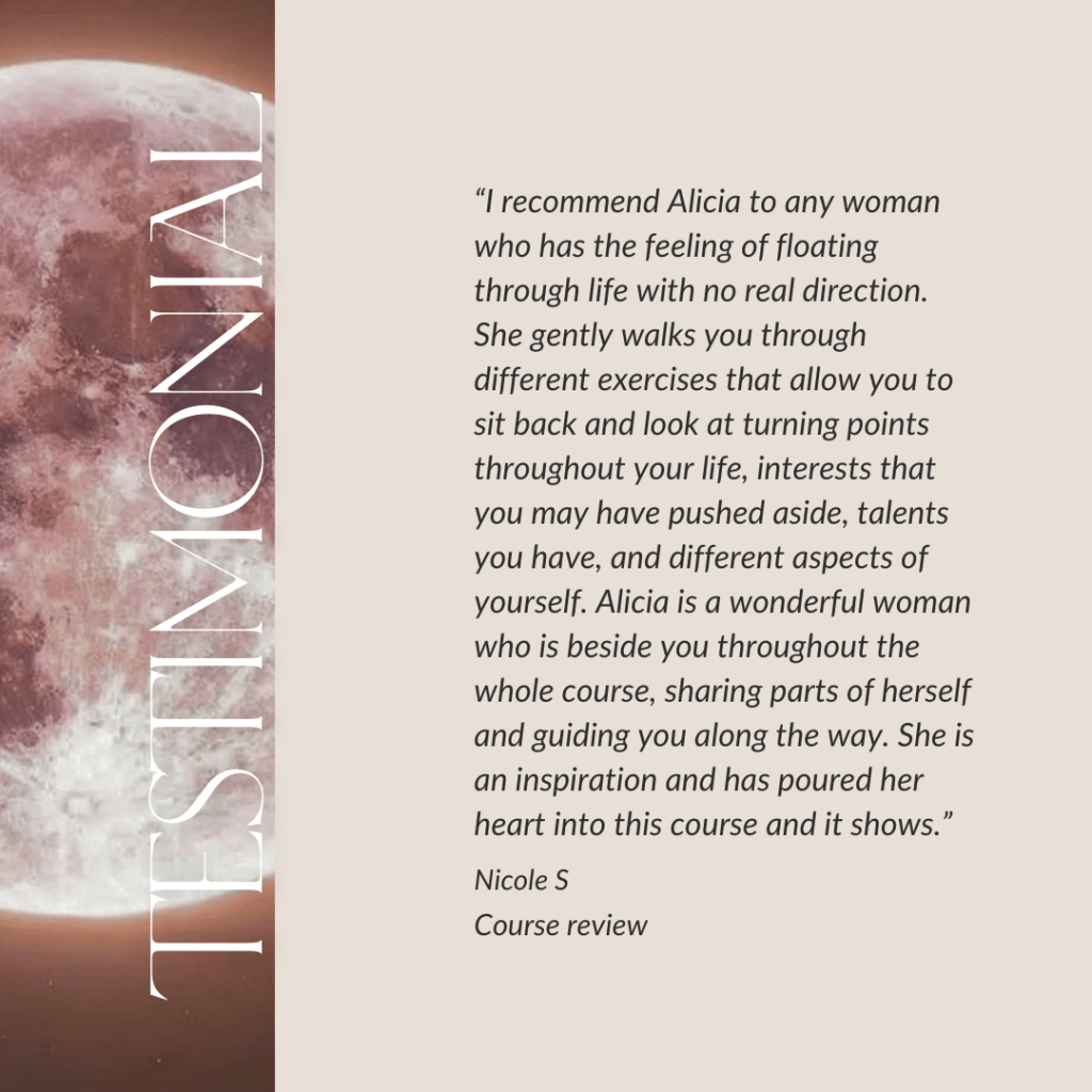 “I recommend Alicia to any woman who has the feeling of floating through life with no real direction. She gently walks you through different exercises that allow you to sit back and look at moments throughout your life, interests that you may have pushed aside, talents you have, and different aspects of yourself. Alicia is a wonderful woman who is beside you throughout the whole course, sharing parts of herself and guiding you along the way. She is an inspiration and has poured her heart into this course and it shows.”